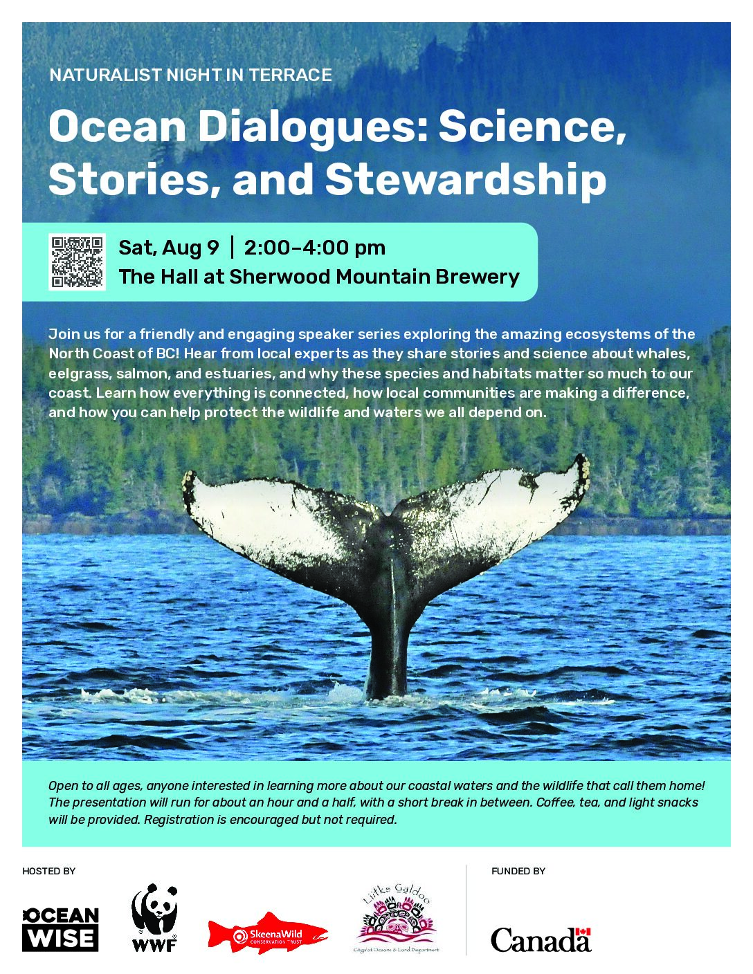 Join us for a friendly and engaging speaker series exploring the amazing ecosystems of the North Coast of BC! Hear from local experts as they share stories and science about whales, eelgrass, salmon, and estuaries, and why these species and habitats matter so much to our coast.